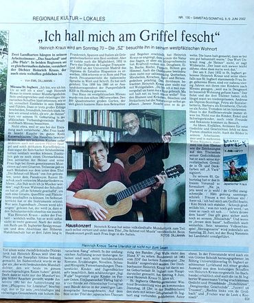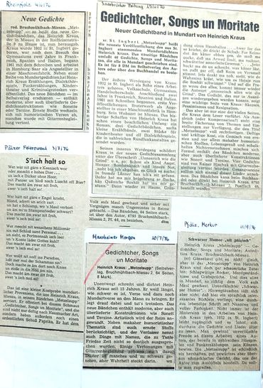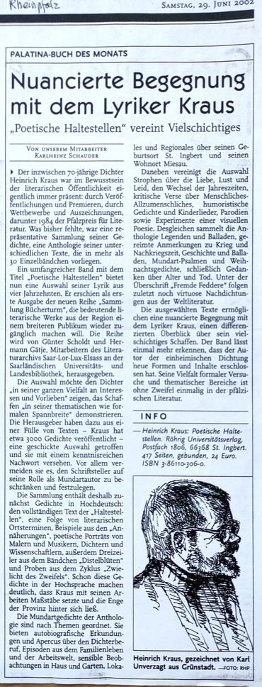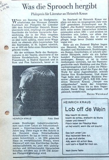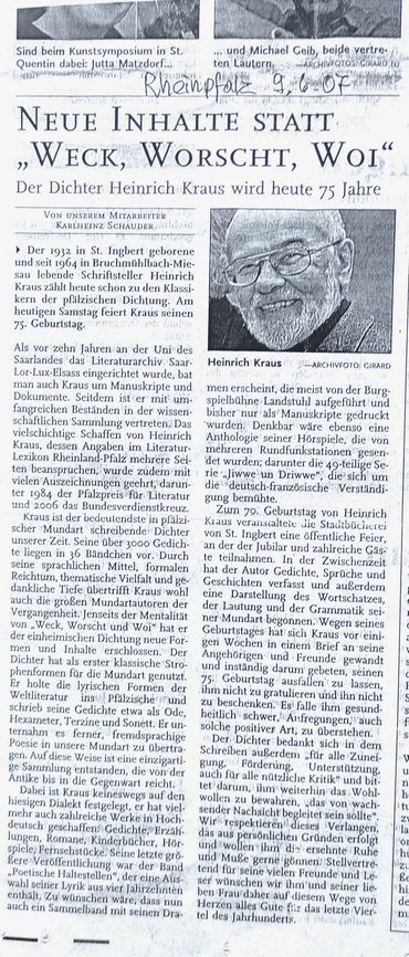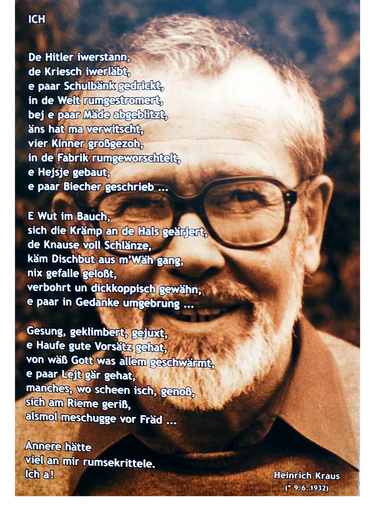 "...un wann mir ebbes infallt, schreib ich's off", sagte Heinrich Kraus einmal zu mir am Telefon. Und ich sah ihn vor mir auf den Wegen um Miesau "off huwwlische Pädcher" gehend, die "Grickelmaus am Chausseeresch" beobachtend, sinnierend, ab und zu listig blinzelnd, verschmitzt lächelnd.