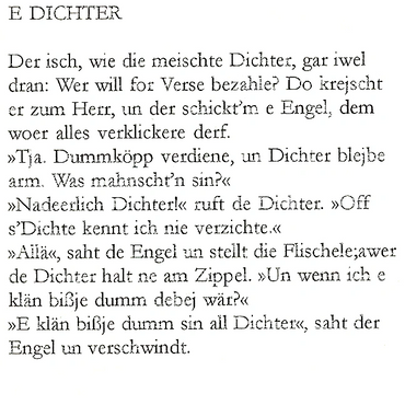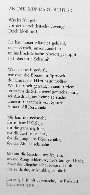 In unseren "gebildeten Kreisen" hat es sich noch nicht herumgesprochen, dass Mundarten eigene Sprachen mit eigenen Regeln sind; man hält sie noch immer für "verwaschenes" oder "fehlerhaftes" Schriftdeutsch und daher als ungeeignet für ernsthafte Literatur. Man sollte meinen, dass die "Renaissance der Mundart", von der neuerdings so oft gesprochen wird, ihr zu einem höheren Ansehen verholfen hätte. Aber gerade das Gegenteil ist der Fall. Diese Renaissance hat zu einem inflationären Umgang mit Mundart geführt. Es entstand eine Vielzahl von Mundartbüchern von selbsternannten Dichtern, die (...) wild drauflosdichten.