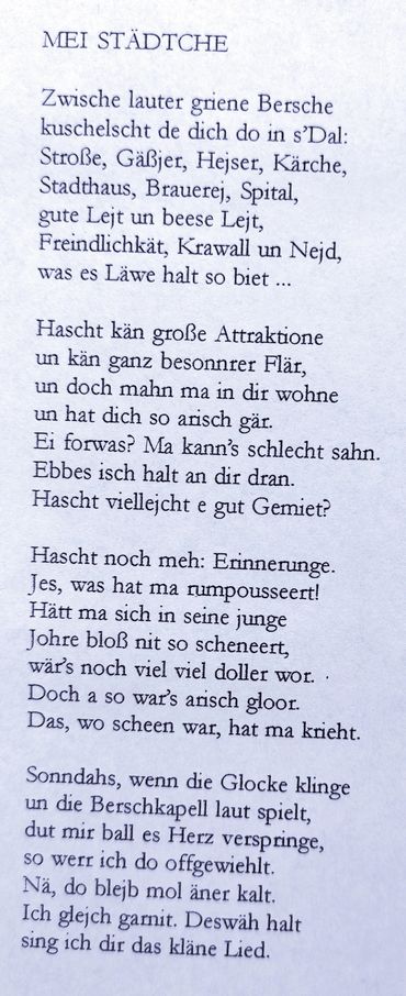 Es ist verständlich, dass diese Mundartdichter in den Kreisen unserer "Kulturverantwortlichen" als "Heimatdichter" belächelt werden und ihre Dichtung als "Heimattümelei" verachtet wird. Da diese Verantwortlichen (Redakteure unserer Kulturmedien) es ablehnen, sich mit Mundartliteratur zu befassen, sind sie nicht in der Lage, zwischen guter und schlechter Mundartliteratur zu unterscheiden.